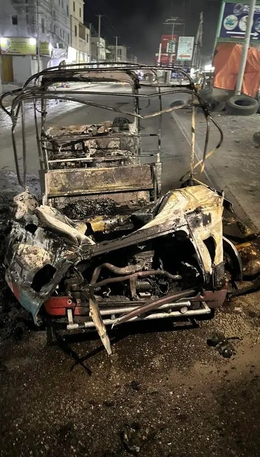 Dukaankii ay qarxiyeen ragga hubeysan oo lagu iibin jiray qalabka dayactirka baabuurta ayaa gebi ahaanba gubtay.