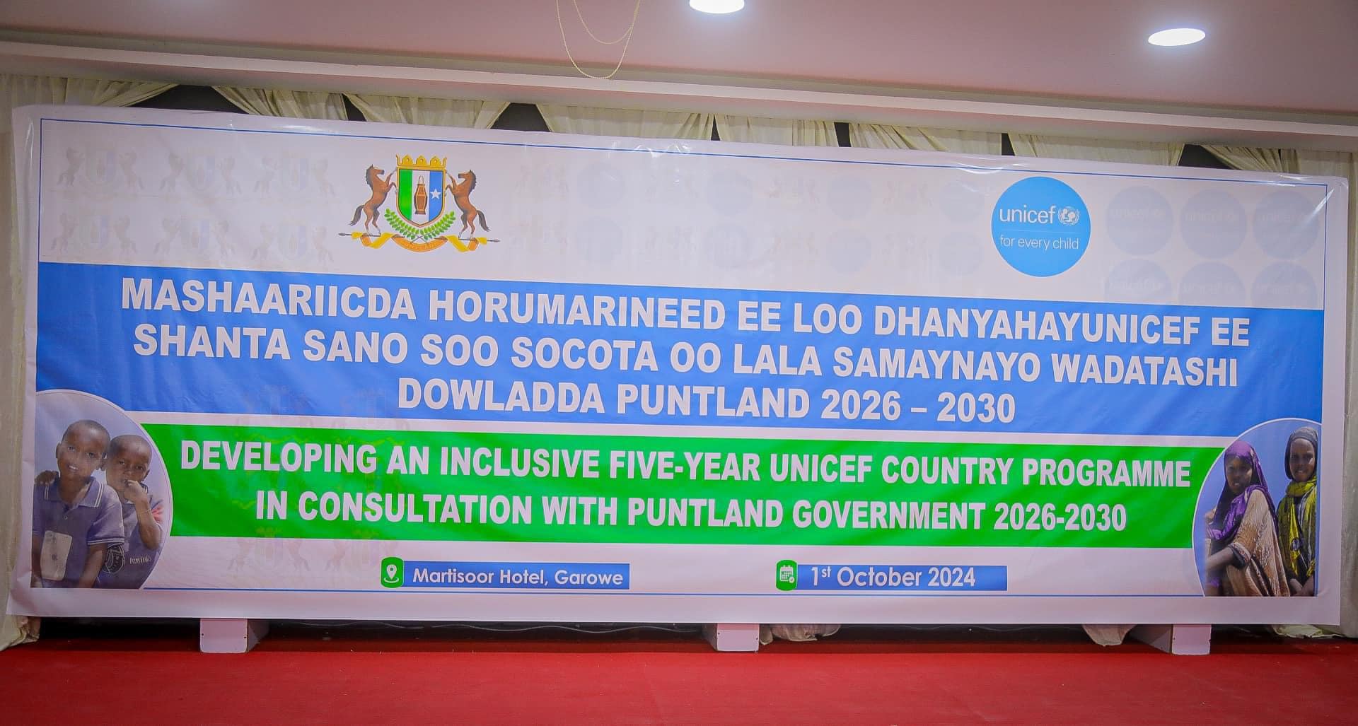 Madaxweynaha Dowladda Puntland Mudane Siciid Cabdullaahi Deni ayaa maanta furay Shirka Dowladda iyo Hay’adda UNICEF, Kaasi oo lagula ogaanayo mashaariicda horumarineed ee UNICEF ka fulinayso Puntland 5-ta sano ee soo socota.