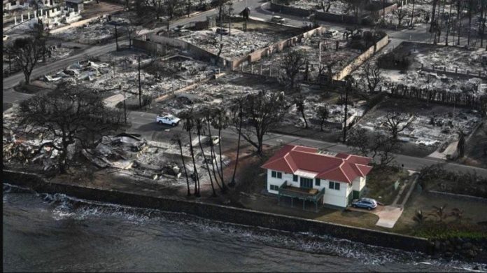 Sawirka guri saqaf cas leh oo uusan dabka taaban iyadoo xaafadii ku hareeraysan ay noqdeen dambas iyo burburka dabkii Maui ayaa noqday mid faafay.